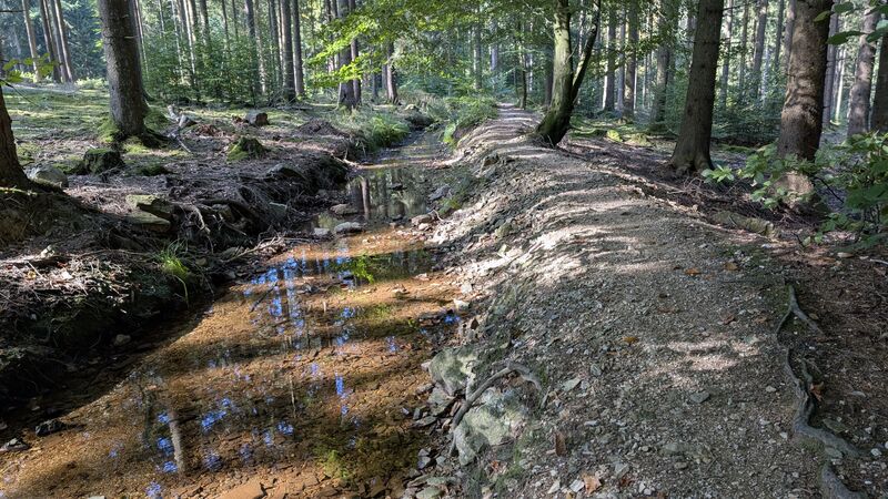 Über viele Kilometer geht es auf schmalen Pfaden mit Wurzelwerk und felsigem Untergrund an ihm entlang. Der Graben führt auch durch die Naturwaldzelle Kreitzberg. Diese ist der erste und älteste Naturwald in NRW und zeichnet sich durch einen sehr alten Baumbestand mit Buche, Eichen und Birken aus.