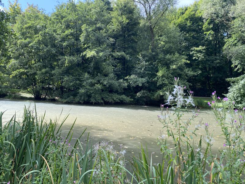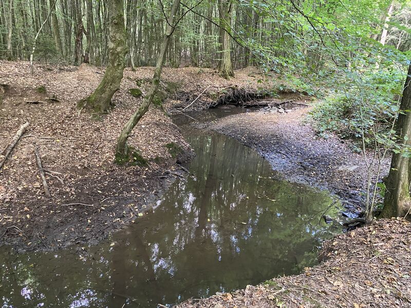 Weiter geht es über teils schmale Pfade mit blühendem Heidekraut zur Straßenbahn-Station in Kippekausen, wo uns weitere Mitwanderer erwarten. Gemeinsam genießen wir den Ausblick auf den idyllischen Bensberger See. Ein weiterer Höhepunkt dieser Wanderung ist der Gierather Wald, ein von mäandrierenden Bächen durchflossenes Naturschutzgebiet, das größere Feuchtgebiete mit Torfmoosen aufweist.