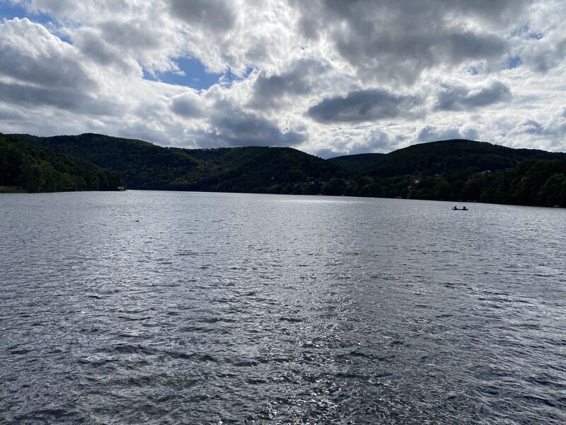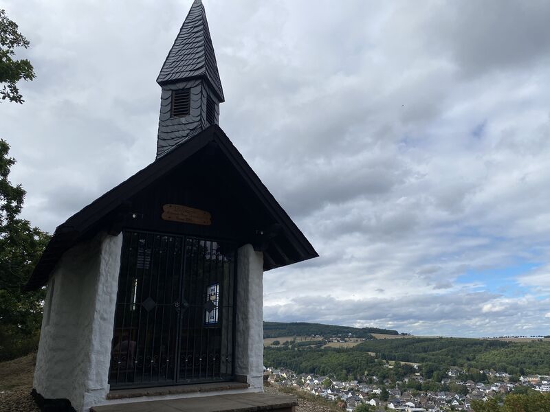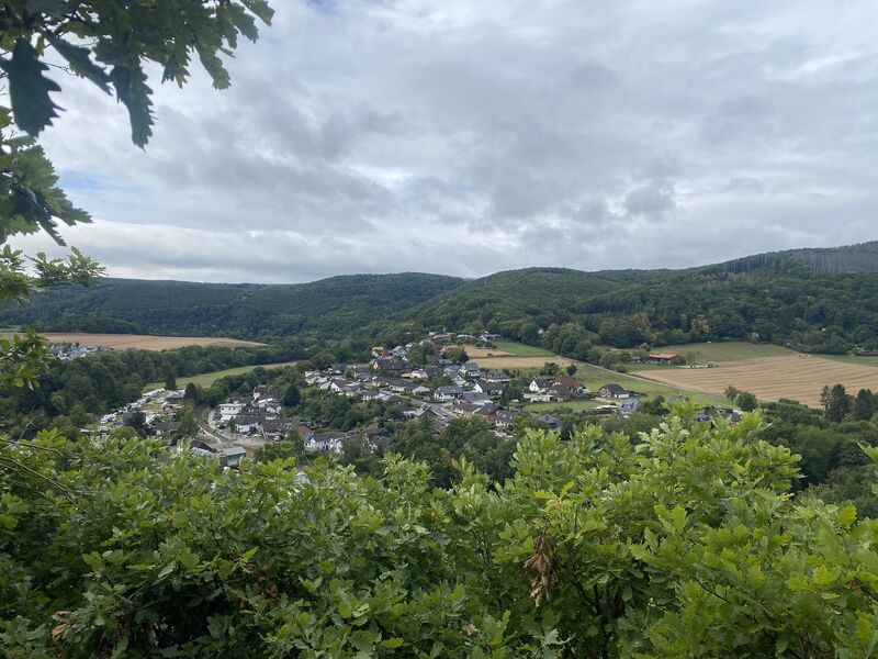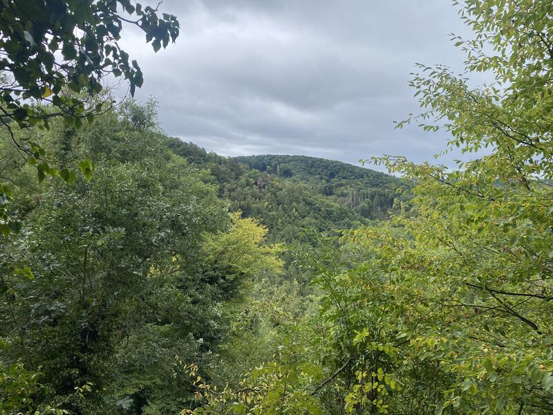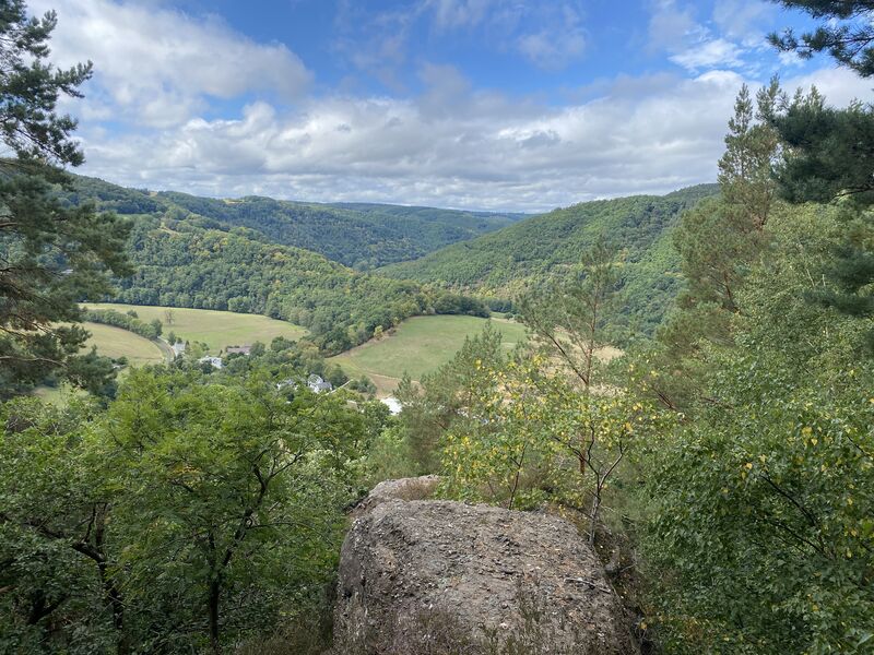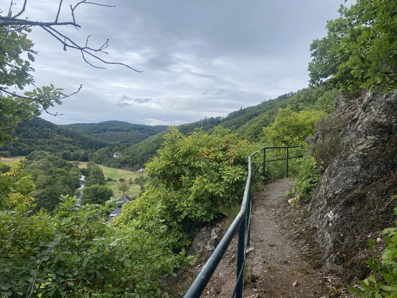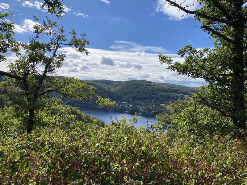 Weitere markante Felsformationen wie Christinenley, Hindenburgtor und Kickley begleiten uns auf unserer Route. Durch Stechpalmen (Ilex) gesäumte Pfade geht es hinauf zum Eugenienstein, wo wir die atemberaubende Aussicht genießen. Von dort gehen wir steil bergab und erreichen die Waldkapelle. Vom Eifel-Blick auf der Mausauel sehen wir auf den Stausee. Über einen Panoramaweg geht es hinunter nach Obermaubach. Dort erwartet uns leckerer Kuchen im Café Flink.